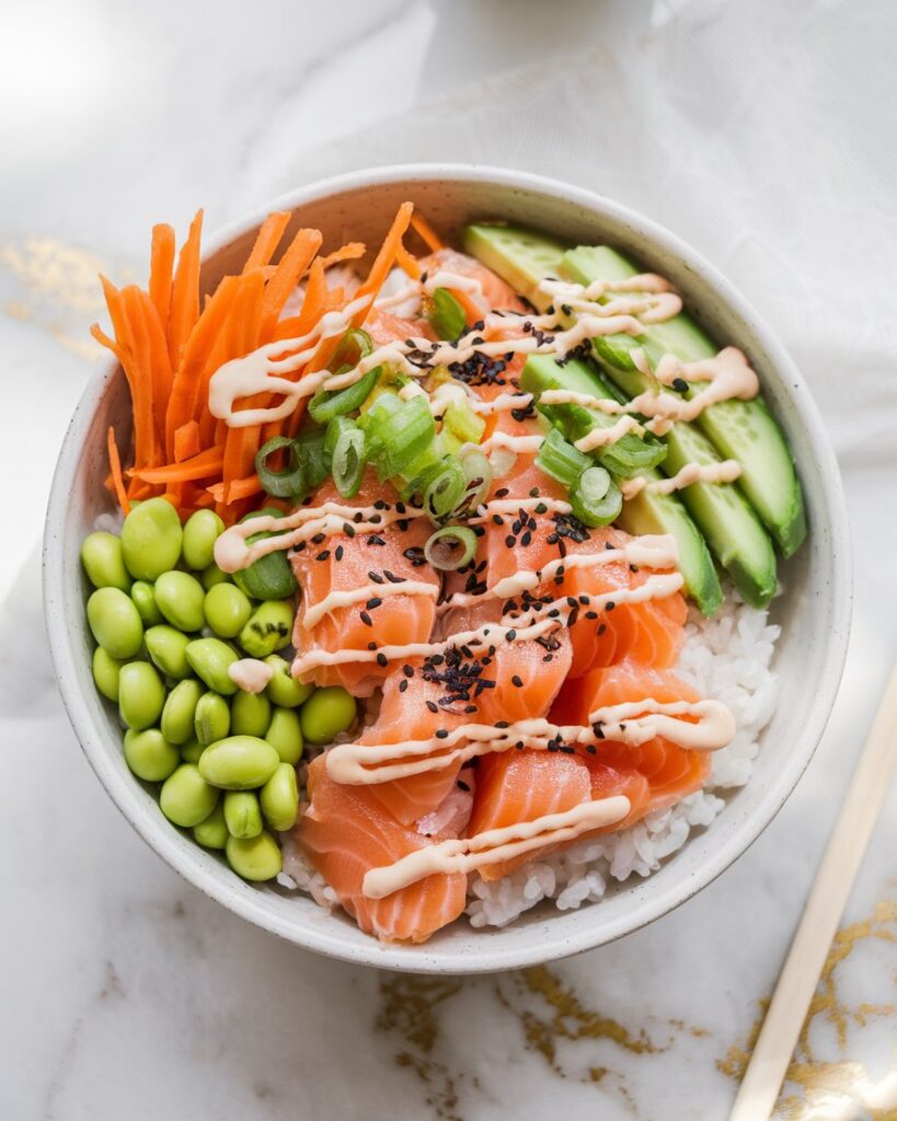 This sushi salad bowl is a nutrient-rich meal with a balance of lean protein, healthy fats, and complex carbs. Salmon provides omega-3 fatty acids and high-quality protein, while avocado adds heart-healthy fats.