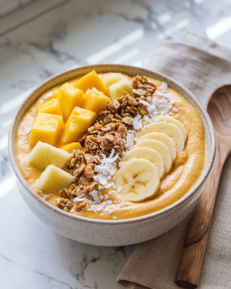 This tropical smoothie bowl is a bright, refreshing way to start your day—or cool off in the afternoon. Made with frozen banana, pineapple, and mango, it blends into a creamy, spoonable base that’s naturally sweet and satisfying. Top it with…