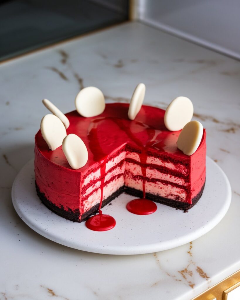 I’m talking about a dessert that combines the velvety richness of red velvet with the creamy tanginess of cheesecake, all topped with a “bloody” berry sauce that makes guests do a double-take. The contrast between the crimson filling and the striking “blood” drizzle creates a presentation that’s both elegant and slightly sinister. Can you imagine anything more perfect for your spooky celebration? Trust me, it tastes even better than it looks.