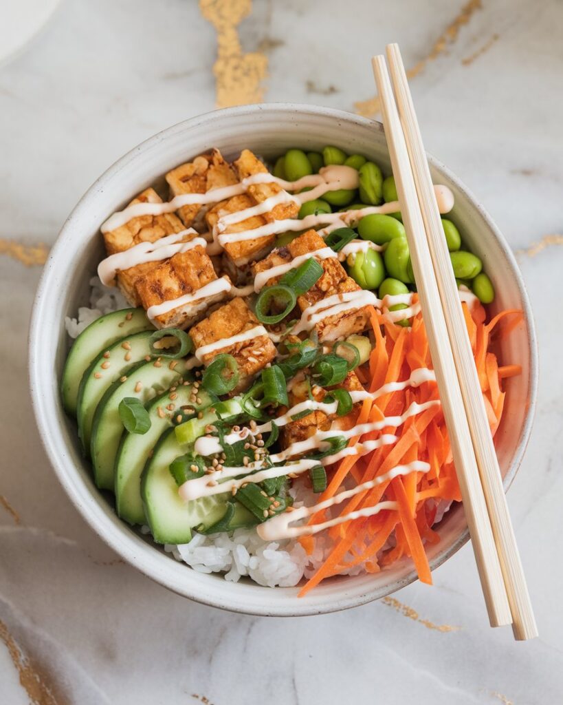 Scoop rice into bowls. Arrange crispy tofu, avocado, cucumber, carrots, and edamame on top.