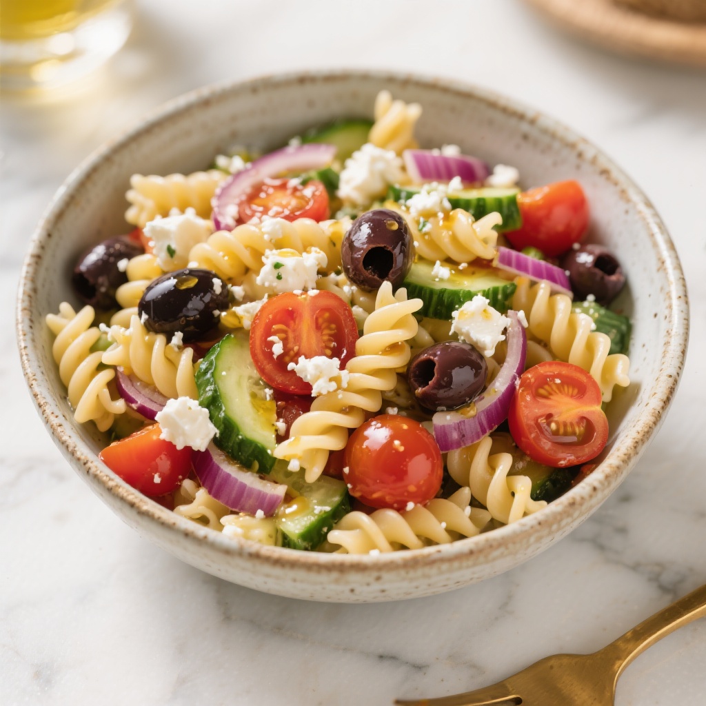 Greek pasta salad is loaded with fiber, healthy fats, and fresh produce. The olive oil and olives provide heart-healthy monounsaturated fats, while feta adds calcium and protein.