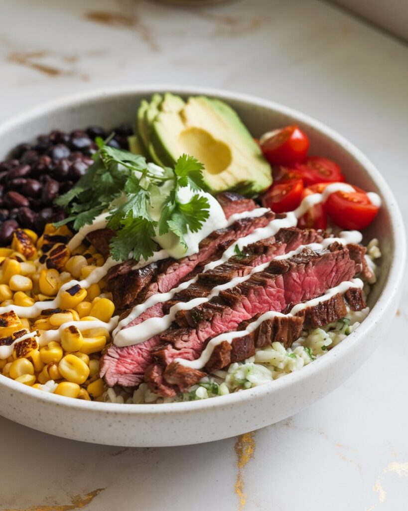 You get bold flavor and balanced nutrition in every bite. The steak is juicy and well-seasoned, paired with crisp veggies, sweet corn, creamy avocado, and tangy lime crema.