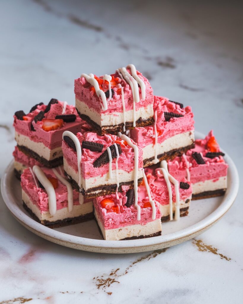 While your cheesecake sets, prepare that signature strawberry crunch topping that gives these treats their name. Mix 1 cup crushed golden Oreos or vanilla wafers with ½ cup crushed freeze-dried strawberries (this is non-negotiable for that authentic crunch) and 3 tablespoons melted butter until combined. Once your cheesecake is fully set, generously sprinkle this gorgeous pink crumbly mixture over the top, gently pressing it into the surface. For an elegant serving option at your next gathering, arrange these delightful bites on a premium cheese board to impress your guests. Cut into bite-sized chunks and watch them disappear faster than you can say “seconds, please.”