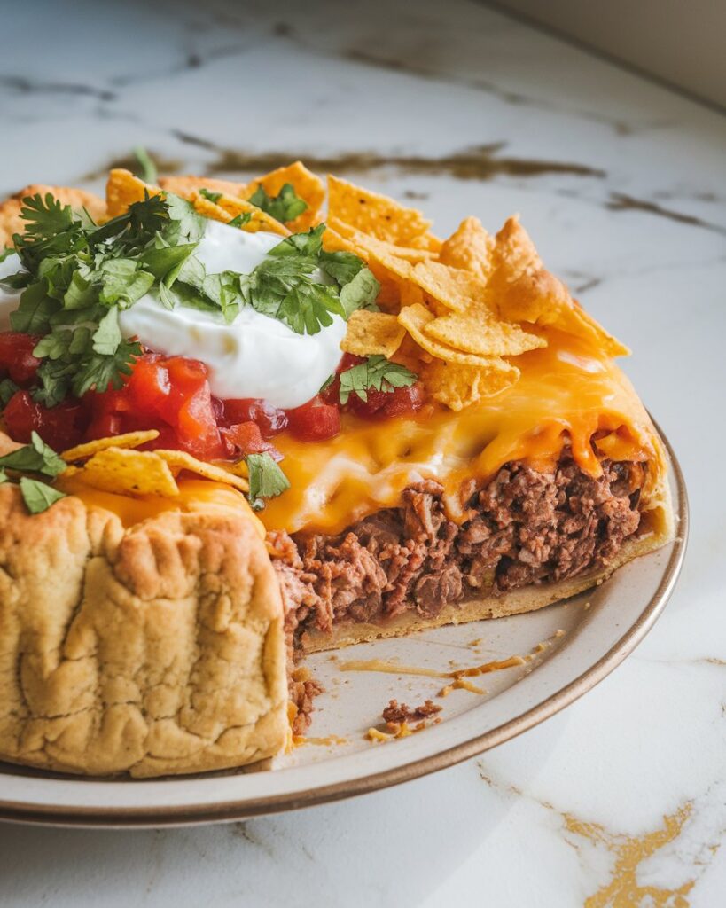 It’s layered with all the best taco flavors—seasoned beef, gooey cheese, and that golden biscuit-style crust that soaks up all the goodness.